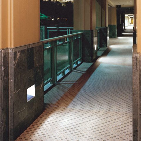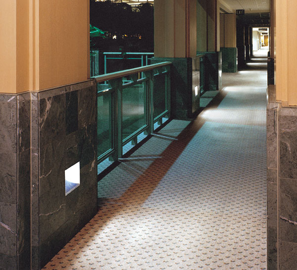 This floor wash design used at Home Savings of America is an effective way to scale back lighting in the evening, yet still provide safe passage for employees that may be working late. The “Trimless” AK Series fixture provided here was modified slightly to accommodate the marble finish on the wall. The standard “Trimless” option allows the gypsum wall finish to end right at the edge of the lighted opening for a clean construction appearance.