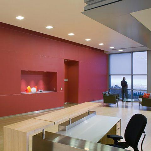 Entering this immaculate reception area of the Lawrence Berkeley National Laboratory, the lighting steps towards the windows beyond and draws you through to study the spectacular view. A perfect complement to the architecture and furniture, the 8″ square aperture “Hole In The Ceiling” fixtures carry the angular theme to the ceiling. The cast GRG (Glass Fiber Reinforced Gypsum) portion of the fixture blends with the ceiling, while the metal fixture housing is attached above.