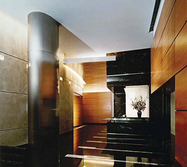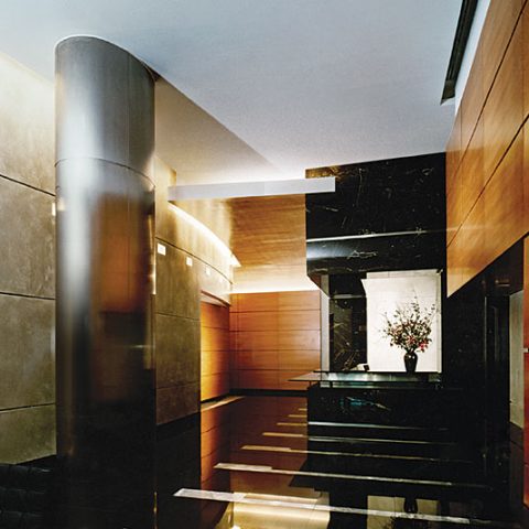 Skillfully applied indirect lighting welcomes you into the Lincoln Triangle lobby. As well, the lighting balances the dark finishes so they don’t overwhelm the space. Our “Hole in the Wall” fixtures along the wall add to the unusual geometric shapes and motif of the space, without adding glare. The cast GRG (Glass Fiber Reinforced Gypsum) portion of the fixture blends with the wall and there is no metal trim or lamp within view. The indirect lighting theme carries through the lobby and peaks at the reception desk.