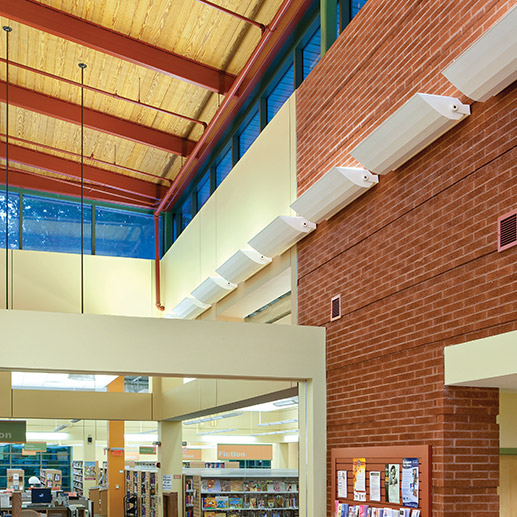 Always bright, lighting up ideas and the future, the Oakton Library stands ready to explore. Abundant natural light saturates the space while ELP’s A15 Series fixtures, await the dusk. From two sides, they indirectly reflect light from the ceiling to rain down into the aisles. The results are very comfortable, day or night, and quite conducive to learning.