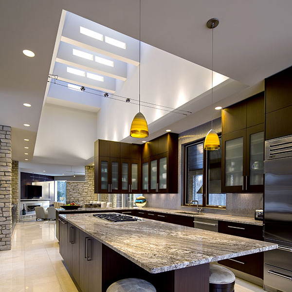 This gorgeous Toledo, Ohio Residence features an immense skylight spanning the entire length of the expansive, gourmet kitchen and formal dining area. Incorporating several of the indirect HITW (Hole in the Wall) luminaires into the skylight ensures this vibrant expanse escapes the “black hole” effect after dark.