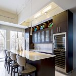 Additional HITW (Hole in the Wall) fixtures were used to highlight the wet bar and wine storage by creating a beaconing halo of indirect light above the beautifully crafted cabinets.